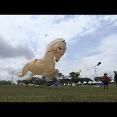 | Giant inflatable sea creatures and cartoon characters hover above a field as kite enthusiasts from around... |