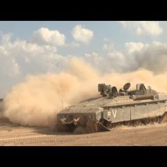 | A convoy of Israeli armoured personnel carriers drive in clouds of dust near the border with Gaza. Israeli... |