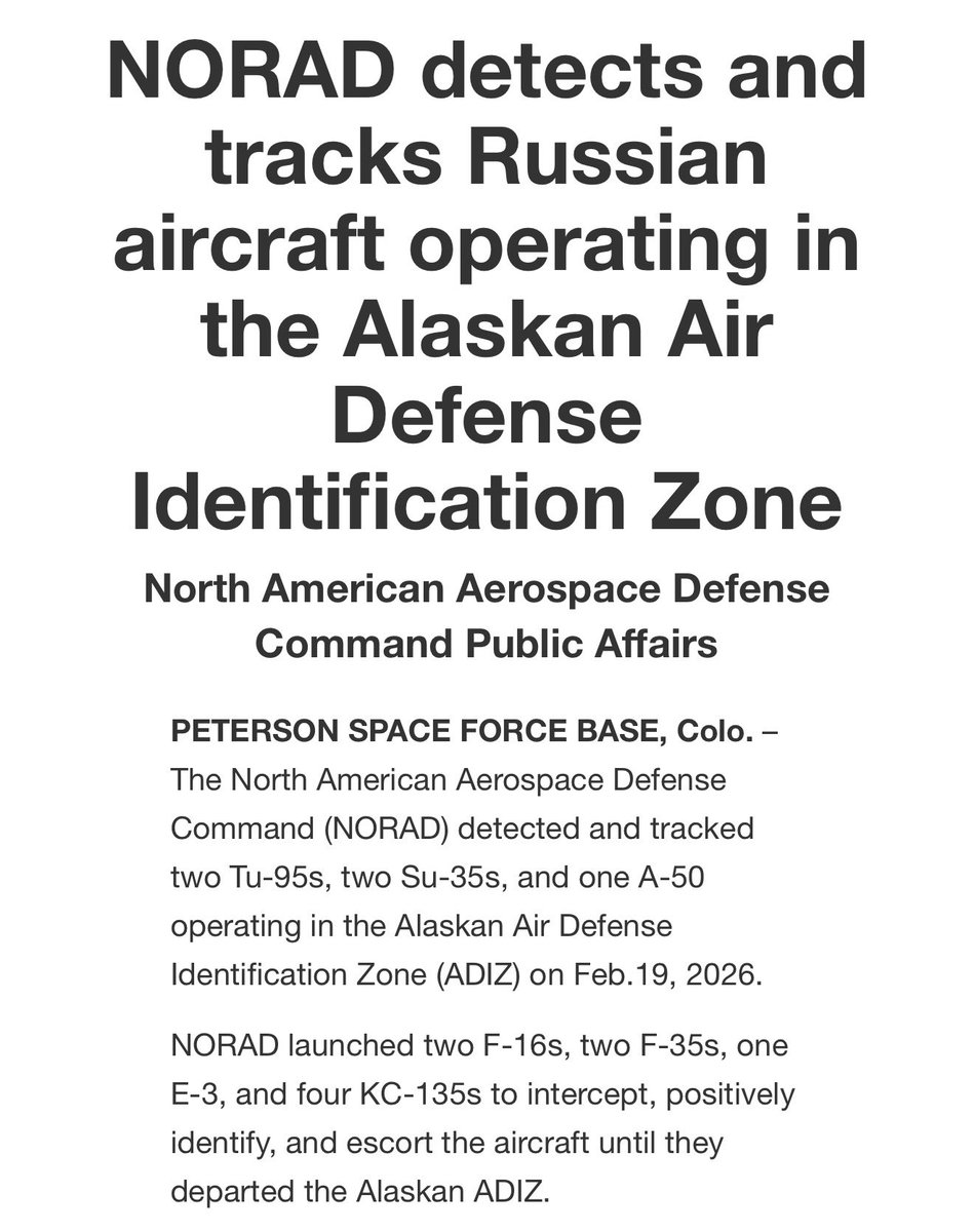 Security and Intelligence | | | @SpiesVespers Feb 20, 2026 OTD Feb 20, 1939, a Nazi rally took place at Madison Square Garden (old location). Organized by the German American Bund, more than 20,000 people attended.... OTD Feb 20, 1939, a Nazi rally took place at Madison Square Garden (old location). Organized by the German American Bund, more than 20,000 people attended.— SPIES&VESPERS (@SpiesVespers) Feb 20, 2026... | | | @sentdefender Feb 20, 2026 The North American Aerospace Defense Command (NORAD) reports that it detected and tracked two Tu-95s, two Su-35s, and one A-50 with the Russian Air Force operating Thursday, February 19, within the Alaskan Air Defense Identification Zone (ADIZ). In response, NORAD scrambled two F-16s, two F-35s, one E-3, and four KC-135s to intercept, pos... The North American Aerospace Defense Command (NORAD) reports that it detected and tracked two Tu-95s, two Su-35s, and one A-50 with the Russian Air Force operating Thursday, February 19, within the Al... | | | @sentdefender Feb 20, 2026 Another C-5M Super Galaxy arriving now in Europe. Another C-5M Super Galaxy arriving now in Europe.OSINTdefender (@sentdefender)Wow, three of the U.S. Air Force's C-5M "Super Galaxy" Strategic Heavy-Lift Aircraft are currently airborne at the same ti... | | | @Osinttechnical Feb 20, 2026 https://t.co/sCCu6DQnVL https://t.co/sCCu6DQnVL— OSINTtechnical (@Osinttechnical) February 20, 2026... | | | @Osinttechnical Feb 20, 2026 ADS-B via @flightradar24 ADS-B via @flightradar24— OSINTtechnical (@Osinttechnical) February 20, 2026... | | | | |