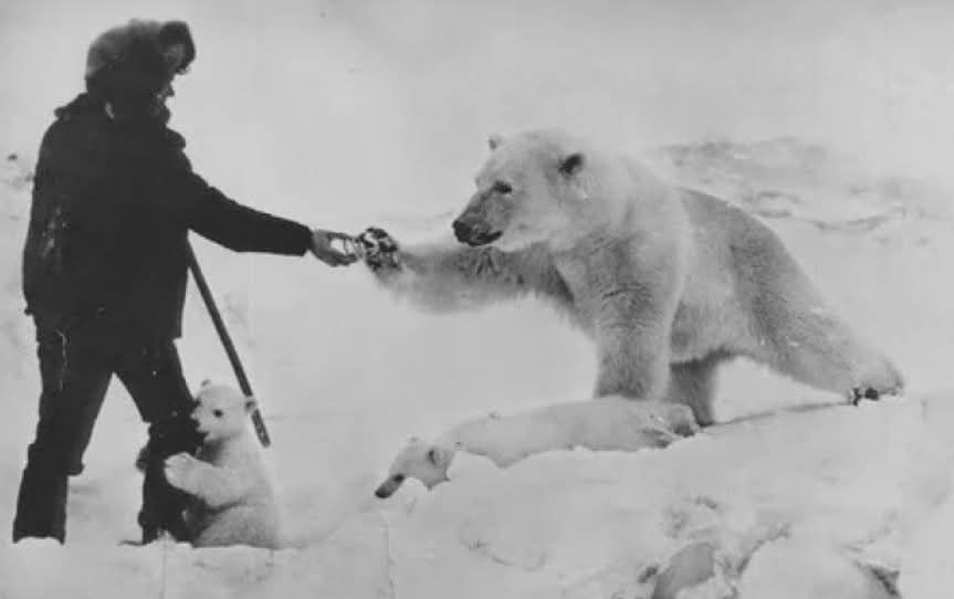 | A historical 1976 black-and-white photograph of Soviet Arctic explorer Nikolai Machulyak hand-feeding a polar bear (and her cubs) near Cape Schmidt (Mys Shmidta), on the coast of the Chukchi Sea in Si... |