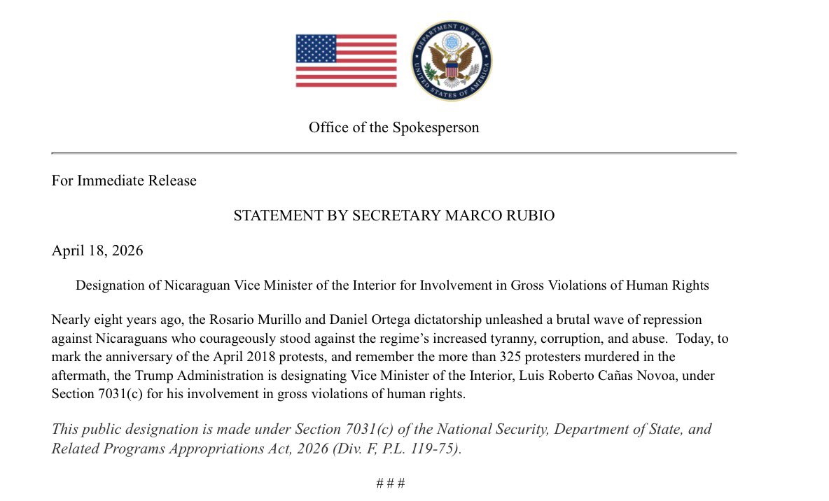 | JUST NOW!! U.S. sanctions Nicaraguan official over ‘brutal wave of repression’Rubio designates Luis Roberto Cañas Novoa for human rights violations on anniversary of 2018 protests👇— Alex Raufoglu (@r... |
