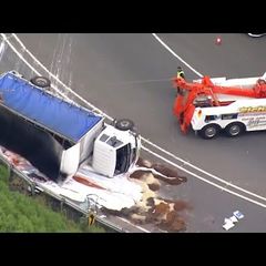 | A truck carrying about six tonnes of paint has rolled over on a busy highway south of Sydney. Paint... |