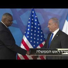 | ראש הממשלה בנימין נתניהו בהצהרות משותפות עם מזכיר ההגנה של ארה״ב לויד אוסטין |